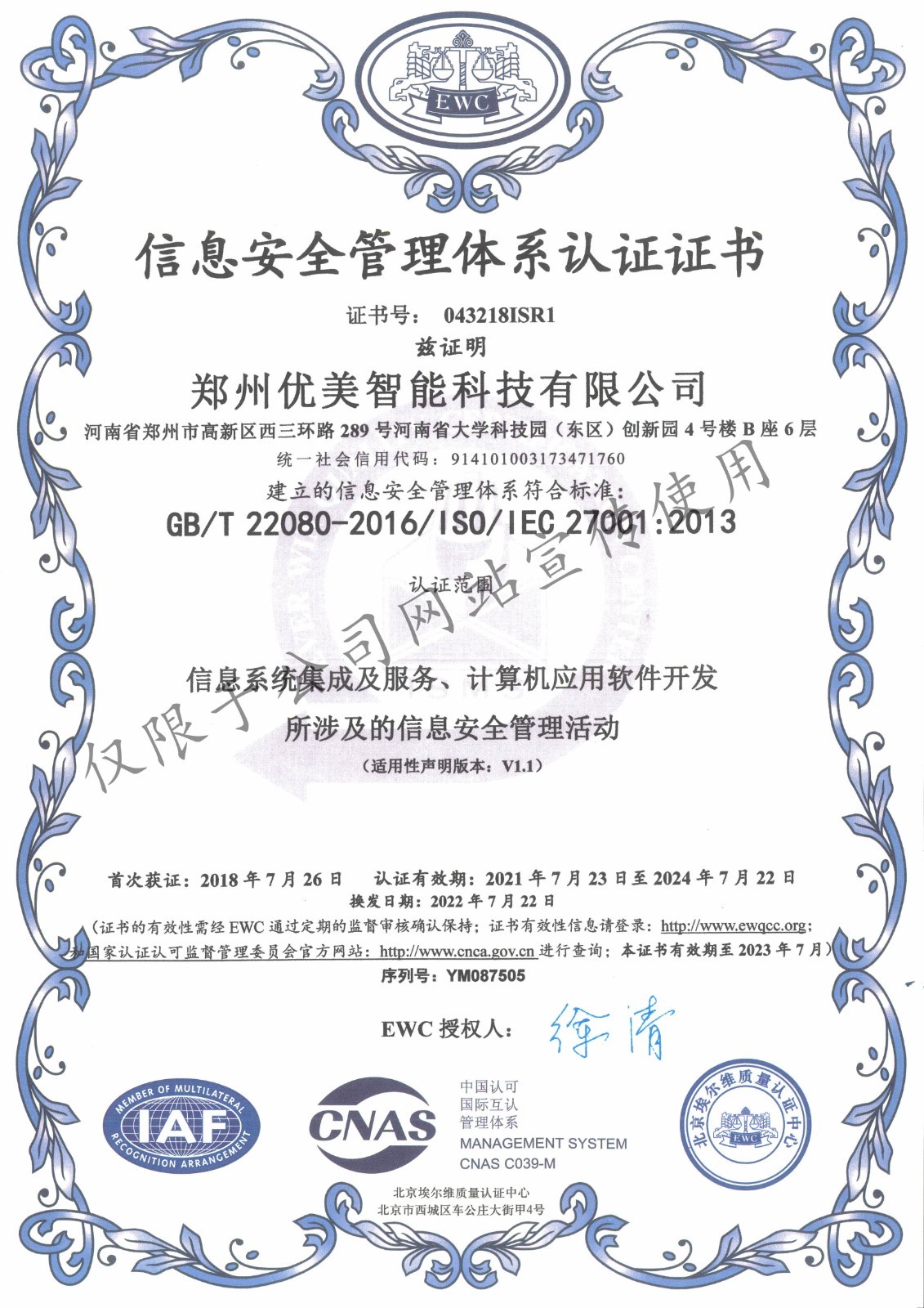 ISO27001ÐÅÏ¢°²È«ÖÎÀíϵͳÈÏÖ¤Ö¤Êé